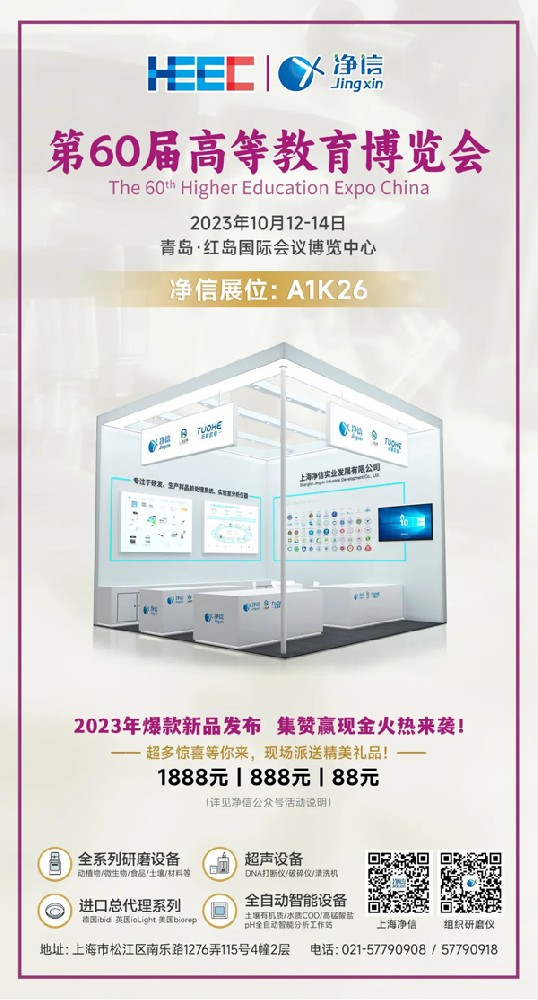 第60屆中國高等教育博覽會在青島紅島國際會議展覽中心圓滿落幕!上海凈信攜樣品前處理設備/小美超聲波系列產(chǎn)品/拓赫機電科技實驗室通用設備,在A1館(展位號A1K26)登臺亮相,為各高校提供樣品前處理解決方案。